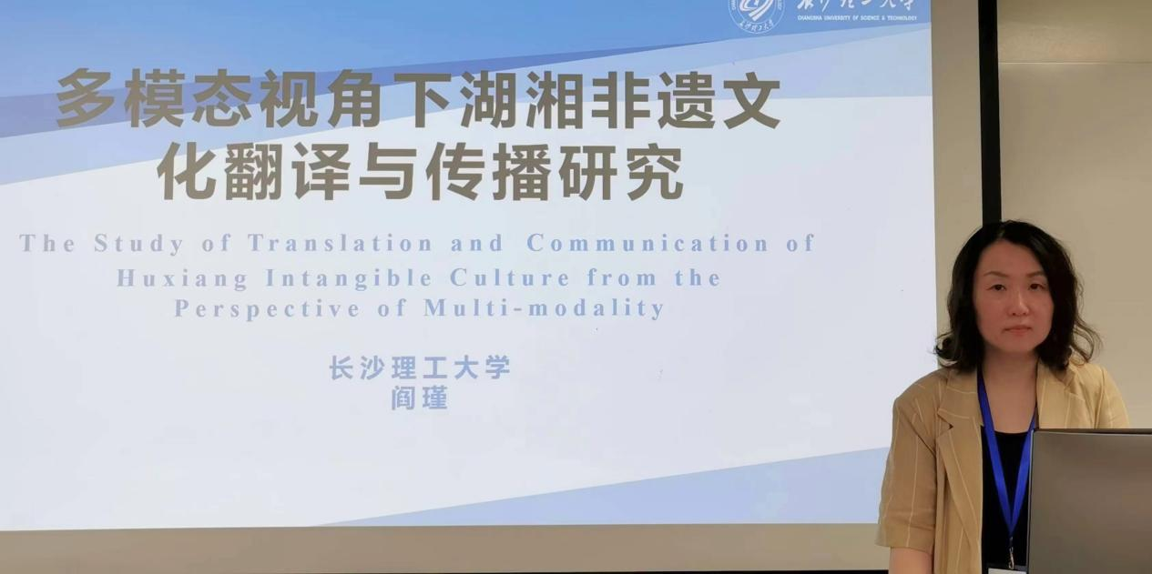 我院公共英语一教研室的阎瑾副教授应邀参加了此次会议,并在多模态翻译平行论坛上做了题为《多模态视角下湖湘非遗文化翻译与传播研究》的学术报告,该研究将多模态话语分析理论与应用翻译相结合,从文化、语境、内容、表达四个层面对湖湘非遗纪录片《长沙客•风物》的叙事策略进行分析,以期为湖湘非遗文化的国际传播带来启示。报告引起了与会专家的强烈兴趣,来自全球各地的多名专家学者与阎瑾老师就湖湘非遗文化国际传播策略问题进行了探讨。