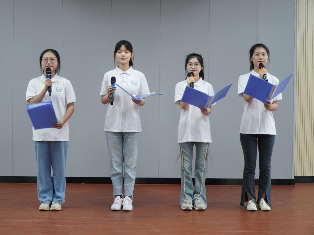 仪式上,还举行了本年度新教师入职仪式,老教师代表、学院领导为新入职的四位教师佩戴校徽。来自不同年级的4名学生带来诗朗诵《外国语学院,我想对您说》,通过朗诵表达了外院学子立足当下、展望未来,立志成为一名“文化摆渡者”而不懈奋斗的决心。
