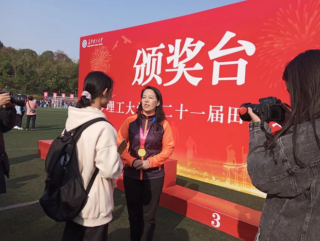 小记者提问:首先恭喜雷英老师在本次飞盘比赛中获得冠军,想问一下您作为学院参加学校第二十一届田径运动会的组织者、参与者及获奖者,有什么感受呢?