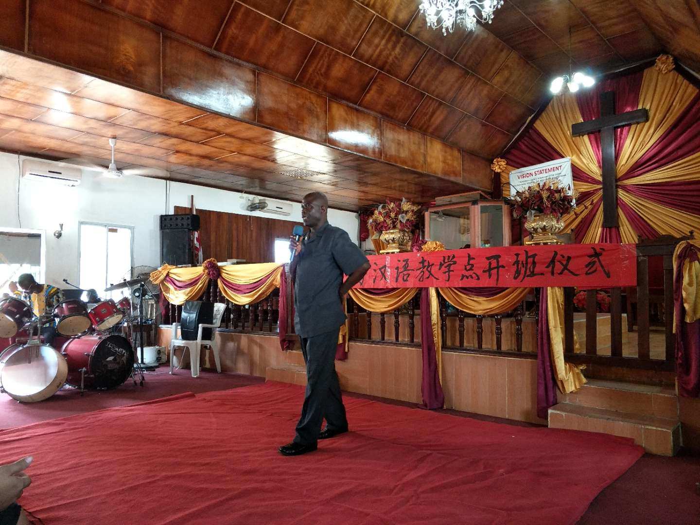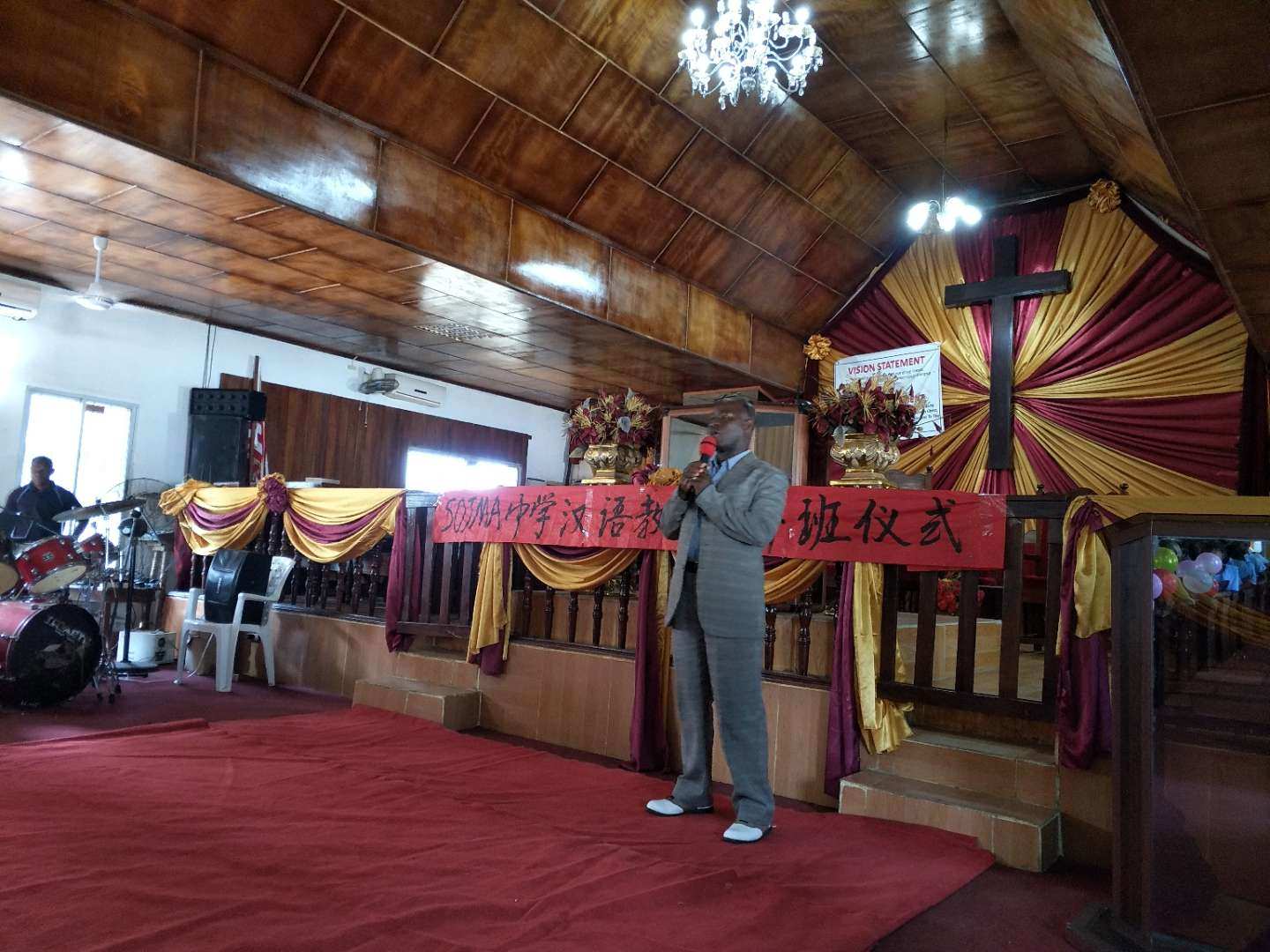 典礼初始,主持人向大家逐一介绍了到会的领导和嘉宾。接着进入领导致辞环节。谢尔曼(Rev.Edwin G Sherman)校长首先向利大孔院表示感谢,感谢孔子学院给SOJMA中学的学生提供了一个学习汉语的机会。他鼓励学生学习汉语,了解中华文化,了解中国,甚至鼓励学生家长也参与到汉语学习行列中来。利大孔院中方院长黄柏青代表利大孔院向各位领导和师生的到来表示热烈的欢迎。他表示非常高兴看到越来越多的孩子加入到学习汉语中的队伍中来,学习汉语给学生们的世界打开了一扇窗户,让学生更好地认识中国,了解世界,并强调汉语学习和文化活动深化了中利两国的友谊。之后,利比里亚大学孔子学院外方院长Dexter表达了利比里亚大学领导层集体对孔子学院汉语教学点的支持,并向学生说明了汉语学习的几个层次,以及孔子学院设有的用于鼓励学生学习汉语的奖学金项目。