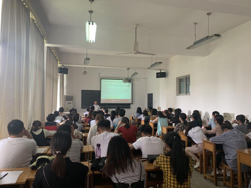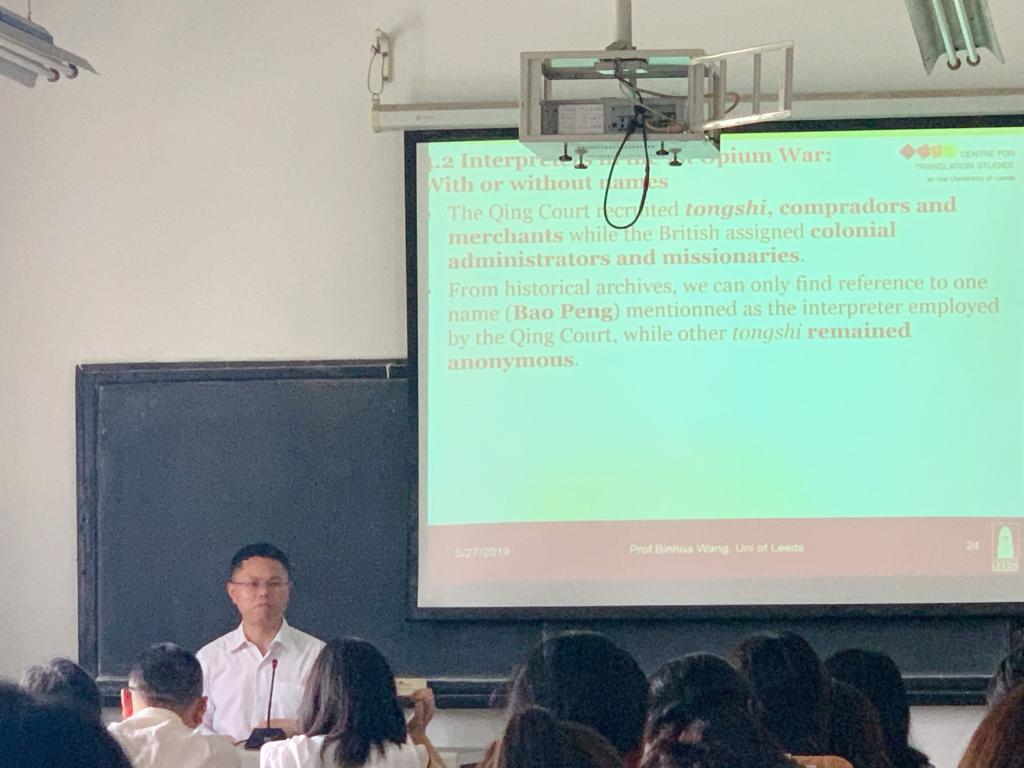 2019年5月28日下午2点半,应外国语学院邀请,英国利兹大学口译及翻译研究教授、博士生导师、“世界翻译教育联盟”学术委员会副主席王斌华教授莅临我院讲学,题目为“从中英早期交往史看口译活动在社会历史进程中的作用”。讲座由外国语学院副院长黄月华主持,外国语学院及其它学院师生到场聆听学习。