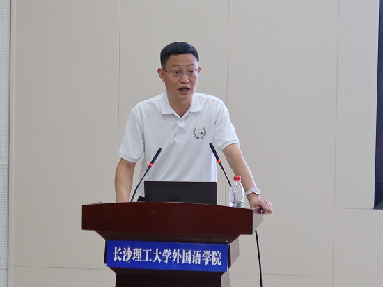 第五环节,段胜峰作主题教育调研汇报,他讲述从6月15日至20日,学院领导率队就外语学科人才培养、工程英语学科建设发展、学生就业创业等问题赴重庆、四川、广东开展调研,先后调研了重庆交通大学、西南交通大学、广州狮子会、广州广高高压电器有限公司、佛山市恒力泰机械有限公司、奇拓集团、佛山外贸网商协会、广州梓柏印刷有限公司等。他从调研过程与案例、结果分析、办学定位与特色、工作交流等四方面进行汇报。他指出,学院班子通过外出调研,深入了解几所高校的整体状况,分析并总结它们的优势和短板,在此基础上,精准定位学院的发展方向和着力点。同时也了解外贸企业发展情况和用人需求,探讨院企合作模式,共同促进学生的实习就业和教学改革创新。