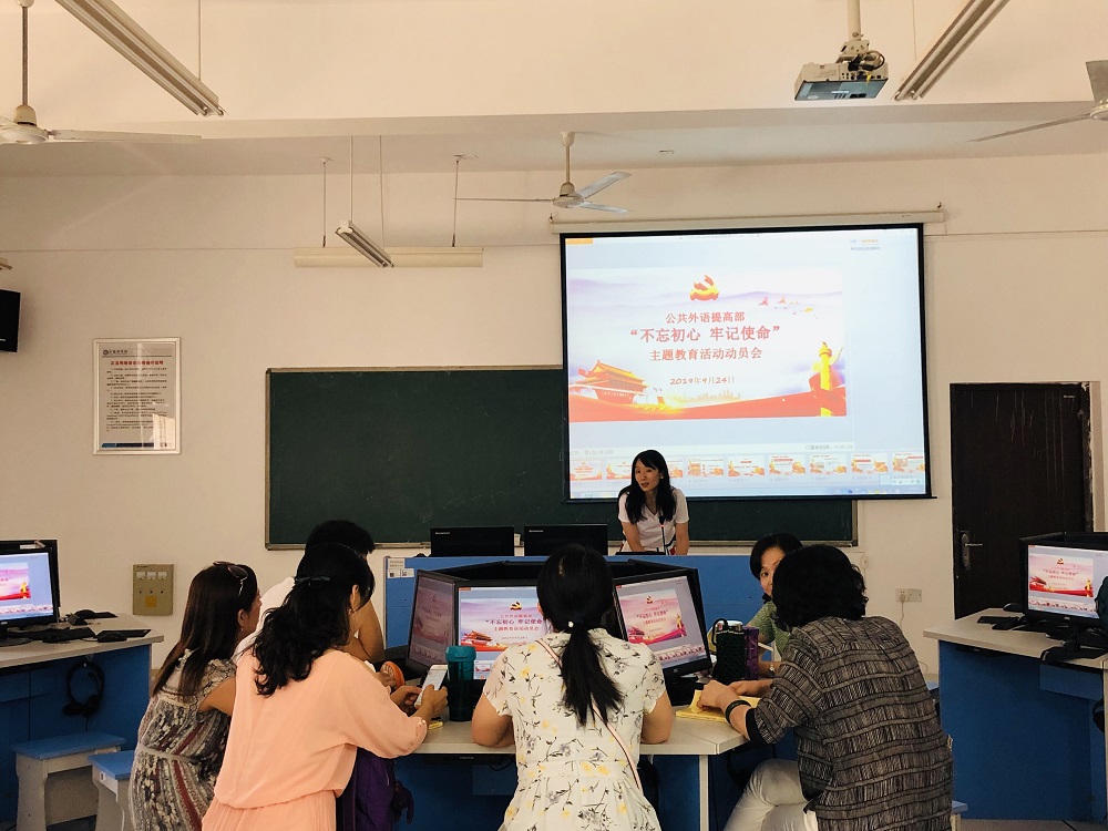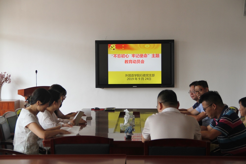 9月24日下午外国语学院教工三个党支部在各自党员活动室召开了党员大会,传达中央、省委、学校和学院“不忘初心,牢记使命”主题教育工作会议精神。会议由各支部书记主持,支部全体党员参加。