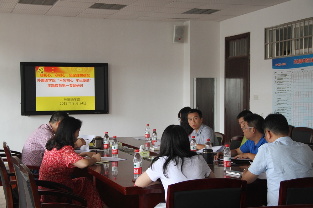 9月24日下午,外国语学院在文科楼A603会议室开展“不忘初心 牢记使命”主题教育第一专题研讨。学院党委副书记陈仁凯主持,学院党政班子全体成员参加,学校主题教育第三督导组负责人、学校纪委副书记兼监察处处长胡秀英出席指导。