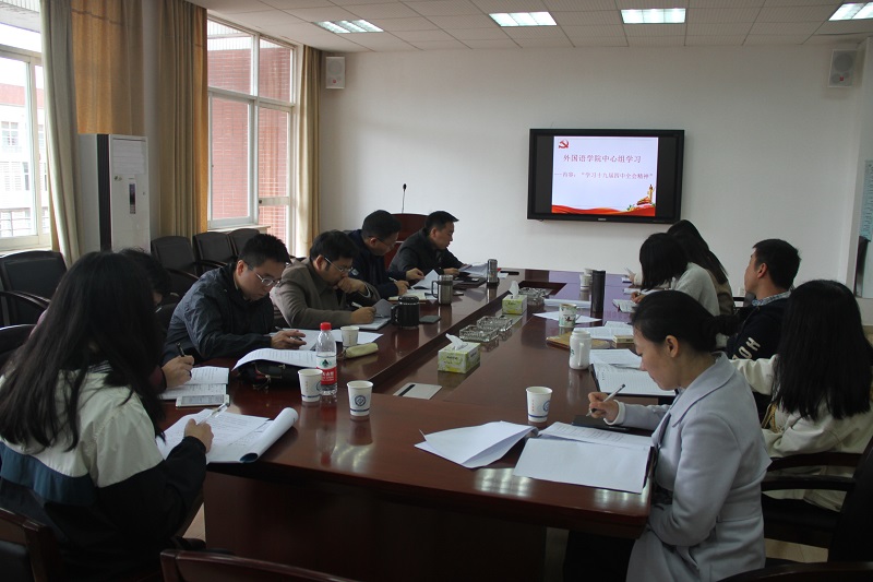 11月15日下午,外国语学院党委中心组在云塘校区文科室楼A-603会议室开展党的十九届四中全会精神专题学习(扩大)。院党委副书记陈仁凯领学,院党委中心组成员和各党支部书记参加学习。