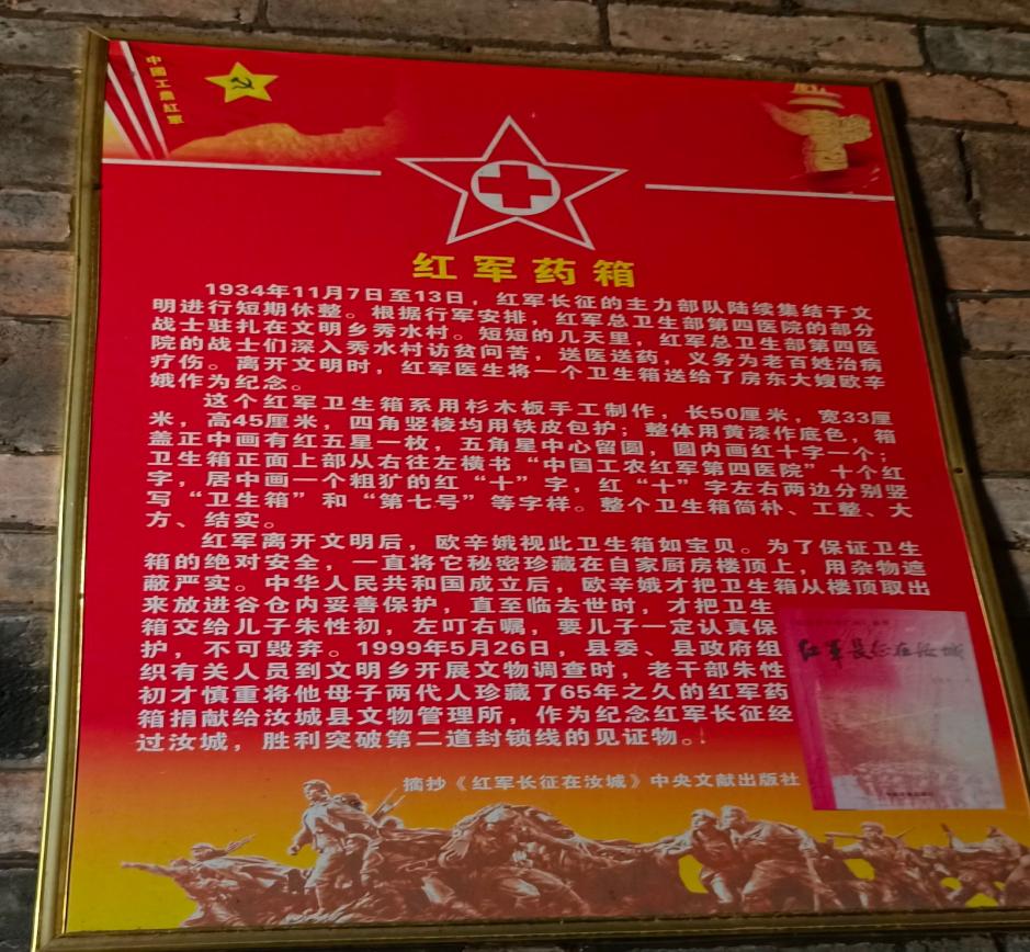 下午14时,实践团成员怀着崇敬的心情踏入司令部的卫生室。在指挥员声情并茂的讲述下,同学们不时停下脚步,仔细参观,聆听讲解。墙上贴着“红军药箱”解说牌,深深吸引了成员们的目光。“这个药箱现存于汝城县文物所,红一方面军司令部的卫生员临走时把装满治疗疟疾的药箱送给朱义芳的老婆欧辛娥,并叮嘱她继续为村子里的患者巩固治疗。”一个小小的药箱承载着军民鱼水情深,见证了红军长征过境汝城突破国民党军第二道封锁线的重大历史事件,也谱写了一曲曲军爱民,民拥军、相互依存、共同前行的佳话。