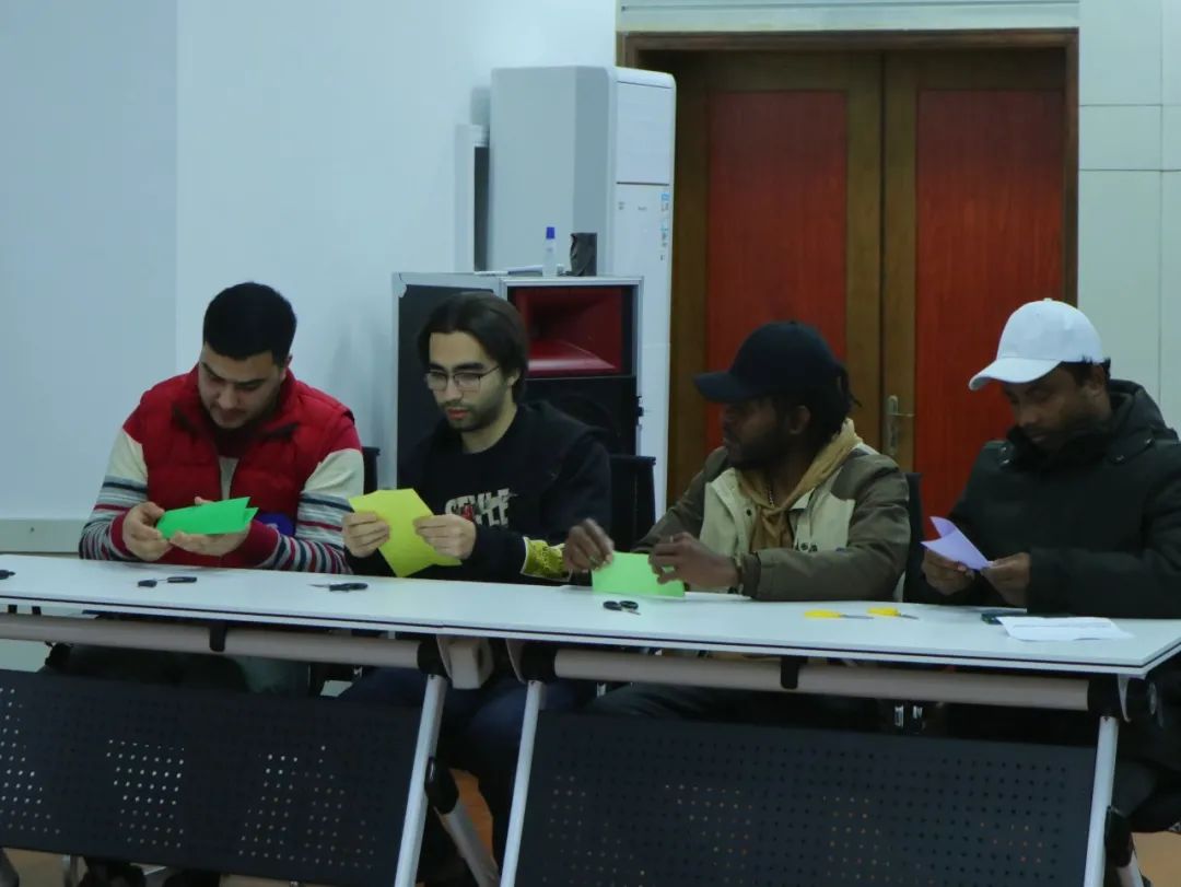 张雅雯同学的授课主题为《走进剪纸》。课堂正式开始前她设置了热身环节,以中国艺术相关的问题为导入,顺利过渡到中国剪纸的主题。讲课期间,她引导留学生组织语言形容剪纸的形状和颜色,带领留学生们在课堂上动手剪纸,使其在实践中体会剪纸的乐趣,在颜色各异的卡纸上,他们剪出了丰富精美的图形,切身体会着中国剪纸艺术的魅力。