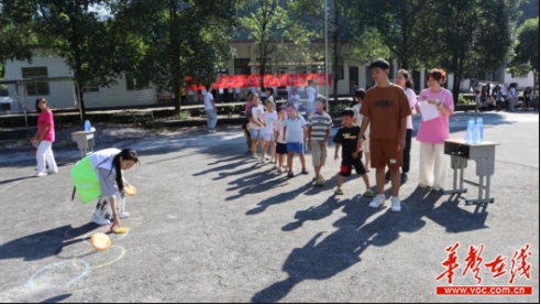 清晨五点,16名支教志愿者已经忙碌起来,用彩线等装饰物装点操场,为孩子们设计了“智取五环”“金牌投手”“火炬传递”等八个创意运动项目。志愿者杨金政还在运动项目中巧妙融入古希腊神话故事,让孩子们在运动中探索奥运起源。