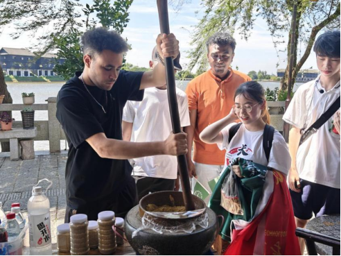 近日,在长沙靖港古镇街头,一群结伴“出游”的中外青年吸引了不少居民和游客的目光。当天,来自LETOU体育平台外国语学院的研究生暑期专业实践团带领来自摩洛哥、苏丹、肯尼亚、尼日利亚等国家的外国友人,共同领略皮影戏、古勋等中华非遗文化,品尝擂茶、甜酒、芝麻豆子茶等中国美食,身临其境地感受中华传统文化的魅力。