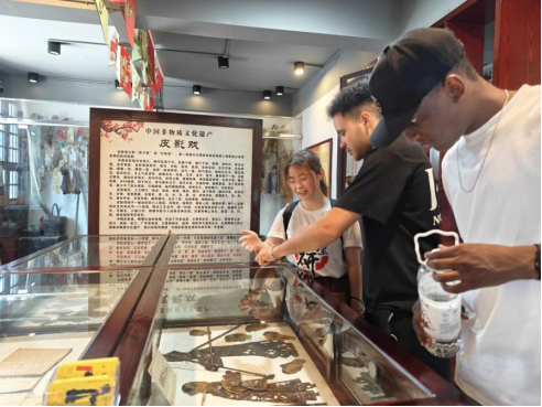 实践团还带领外国友人来到皮影戏馆,邀请非物质文化遗产皮影艺术代表性传承人朱国强先生为大家表演了“孙悟空大战蜈蚣精”一戏。外国友人聚精会神地观赏表演,实践团也为他们进行了详细的解说,让他们能更好地感受到这场演出的精妙之处。
