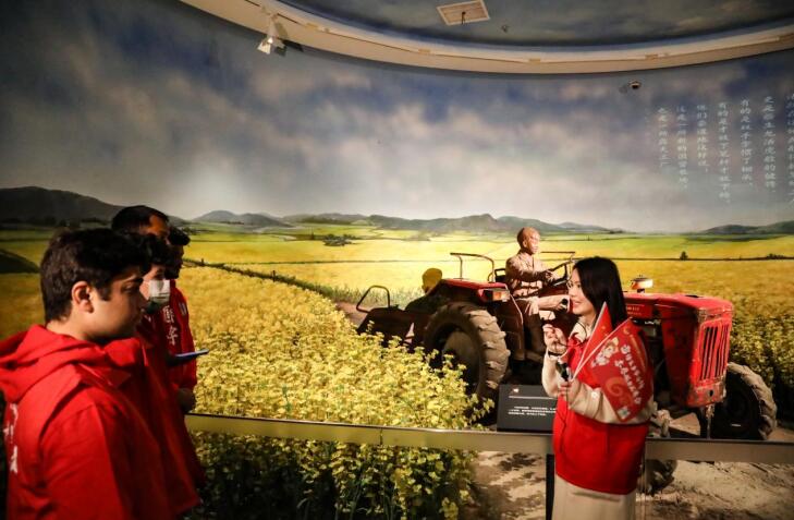 “Good morning, everyone. Now, we’ve come to the exhibition hall of Lei Feng's life story. ”来自英语笔译专业的研究生蒲星宇用流利的英语带领外国友人开启了雷锋生平事迹馆的参观。参观中,雷锋开着拖拉机在团山湖开垦建设的场景引起了留学生的好奇,红色使者团成员秦琪用英文为大家生动讲解了雷锋同志作为拖拉机手建设社会主义新农村的奋斗青春故事。