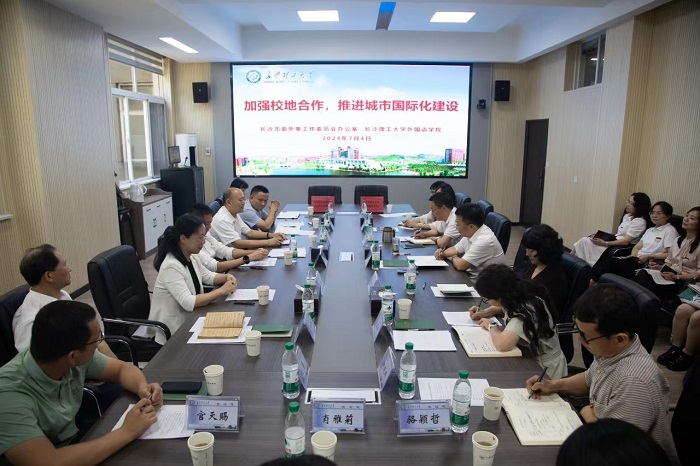 7月4日上午,长沙市人民政府副市长高文棋一行来到LETOU体育平台就“加强校地合作,推进城市国家化建设”展开深入调研。LETOU体育平台副校长张军辉在欢迎词中指出:“外国语学院是LETOU官网打造‘先进文化传承传播前沿基地’的主要承载,必须要在传承创造、传播弘扬具有悠久的历史文化、厚重的革命文化、活跃的现代文化等显著特色的湖湘文化中贡献力量。”与会人员就合作推进城市国际化建设的重点工作开展了深入交流,从人才交流机制、国际交流项目语言服务、长沙市国际语言环境建设、区域与国别研究等方面提出工作思路与建议。