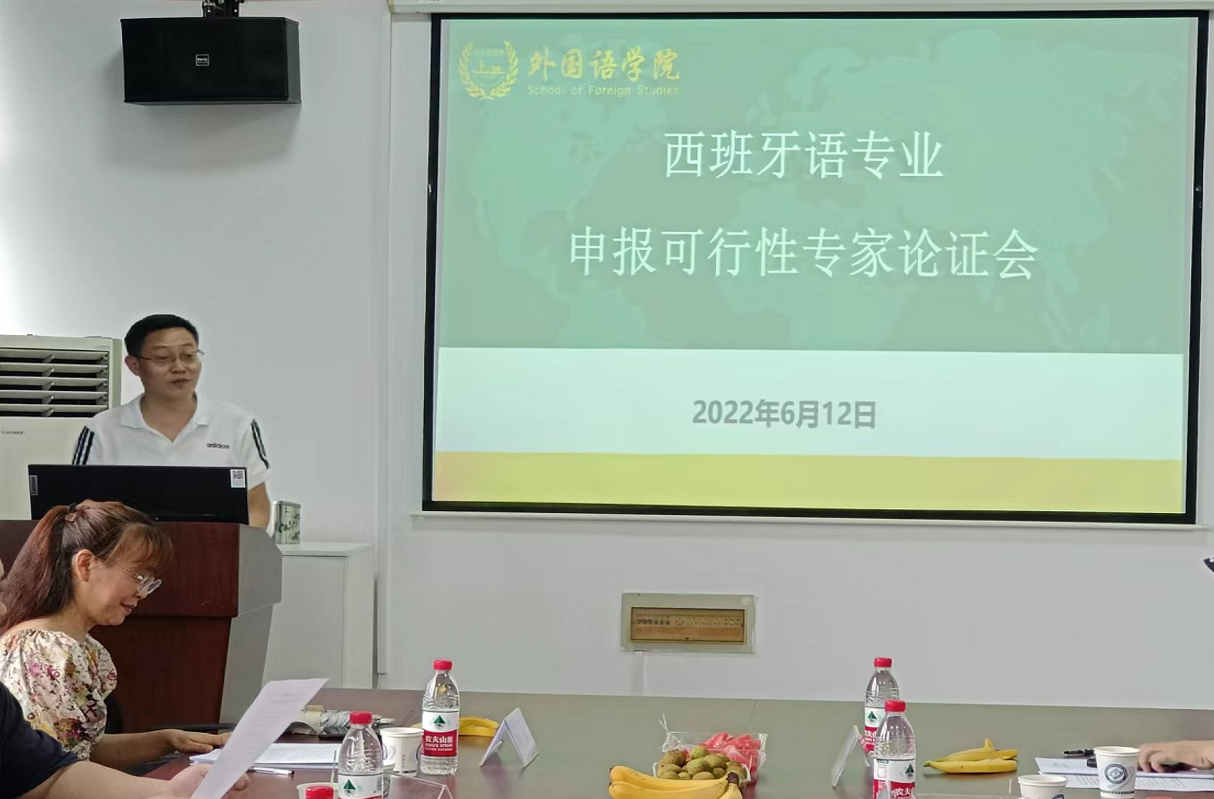 2022 年 6 月 12 日下午,LETOU体育平台外国语学院在金盆岭校区第9教学楼 406 室组织召开了西班牙语专业设置可行性专家论证会。会议采取线下方式进行,邀请了湖南大学刘正光教授、中南大学张少雄教授、湖南师范大学谭福民教授、中南林业科技大学李志奇教授、长沙学院刘芬教授担任专家。论证会由外国语学院院长段胜峰主持,外国语学院副院长季红琴做可行性论证汇报,刘正光教授担任专家组组长,专业申报筹备小组成员陈婧、李颖、刘安琪、裴冉也参加了本次会议。