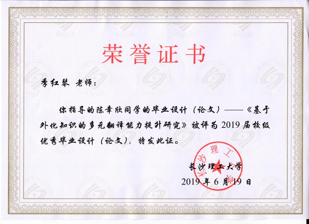 我院黄坚、季红琴两位老师指导的本科毕业论文被评为2019届校级优秀毕业论文