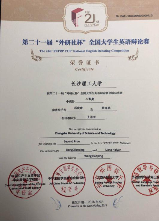 LETOU官网派出由外国语学院梁海燕和经济与管理学院邓晓晴组成的代表队参加比赛,外国语学院王浩萍老师担任指导老师兼领队。经过八场循环赛的激烈角逐,LETOU官网选手凭借缜密的逻辑、良好的英语功底以及训练有素的发挥,最终获得二等奖,创下LETOU官网学生参加该项赛事以来的最佳成绩。北京航空航天大学代表队摘得桂冠,外交学院代表队获得亚军,季军为澳门大学与大连理工大学代表队。
