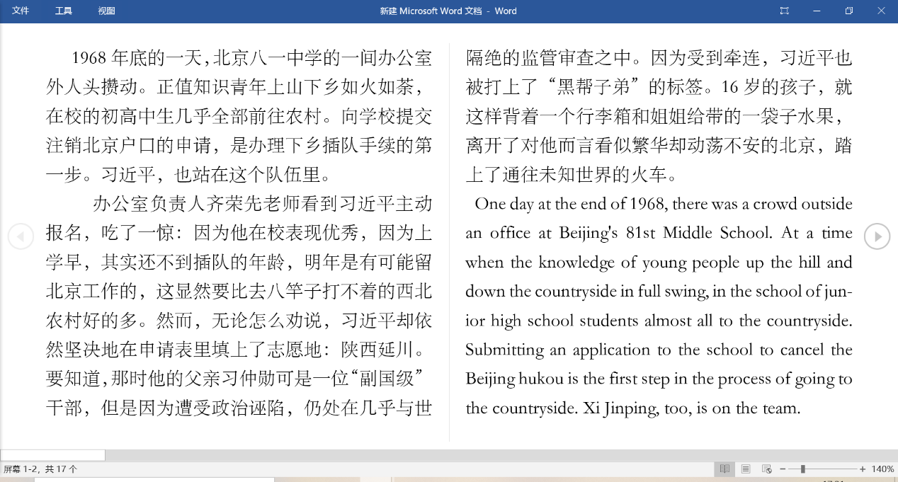 2021年8月12日,来自LETOU体育平台外国语学院的薛丽同学,查阅背景资料,借阅翻译辅助资料,对《习近平的七年知青岁月》节选进行了翻译。《习近平的七年知青岁月》是由中共中央党校出版社编著的采访实录。在之前读过这本书的基础上,有了对这本书基本的了解,思想的感悟,所以这也使得她的翻译的过程中顺畅了一些。当然,其中也免不了一些困难,因为文中有对当地人的采访,所以他们的话带一些地方特色。但是她没有因此退缩,而是利用网络搜集资料,使得译文更加的流畅自然地道。