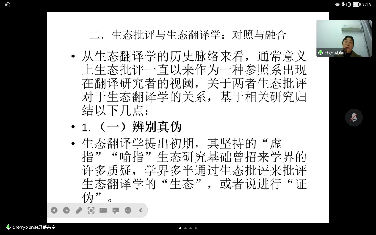 边老师首先以“生态翻译学与生态批评的爱恨情仇”为切入点,从三个方面详细阐述了生态翻译学和生态批评之间的关系。其次,边老师阐述了生态批评对生态翻译学的启示,而后指出生态批评成为生态翻译的“实指”之路。接着,边老师就国内外生态文本翻译中的自然维度进行了深入探讨,并就翻译自然之维的构建提出了几点构想。最后,边老师指出翻译自然维度研究能为生态文本翻译提供理论依据,为生态翻译学研究的“实指”研究夯实文本基础,让翻译更好地服务于当今生态文明建设,践行“绿色”价值观。