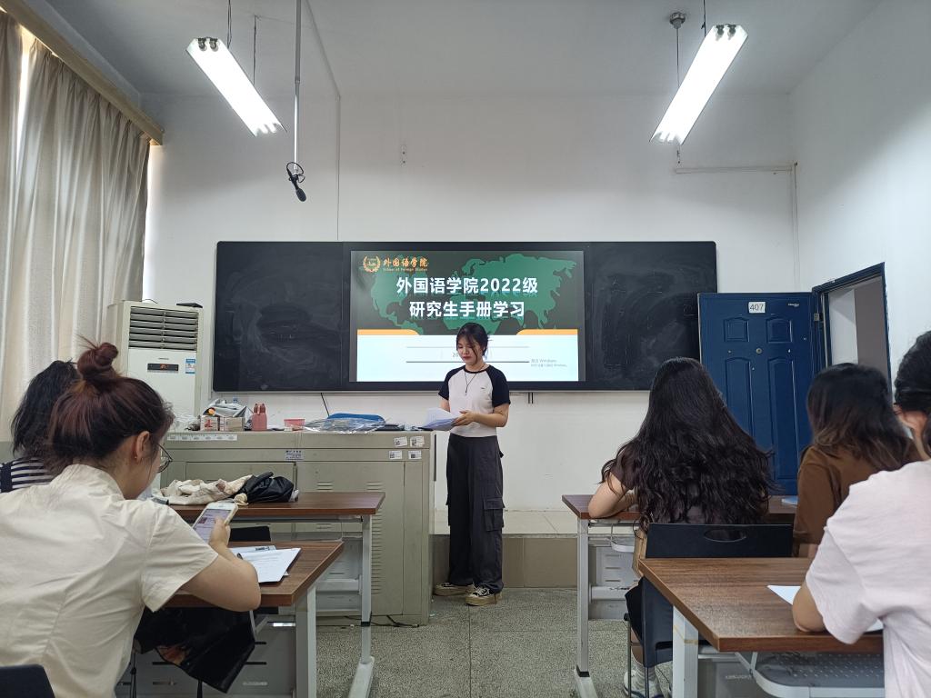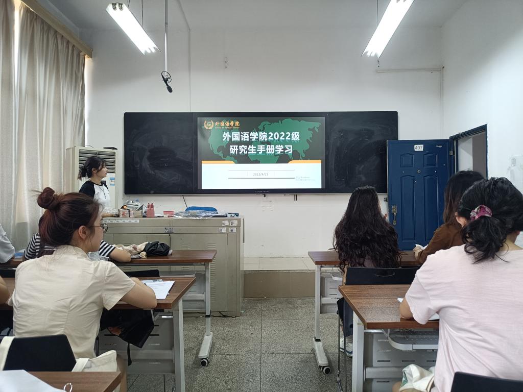 9月14日,为帮助2022级硕士研究生新生更好地掌握《研究生手册》有关内容,熟知日常管理有关规定,外国语学院于9号教学楼407组织2022级《研究生手册》学习。次日,外国语学院于金盆岭校区9号教学楼407教室组织2022级硕士研究生新生《研究生手册》考试,学院研究生辅导员陈若晨及院研会部分成员参与组织、监考,外国语学院全体2022级研究生参加。