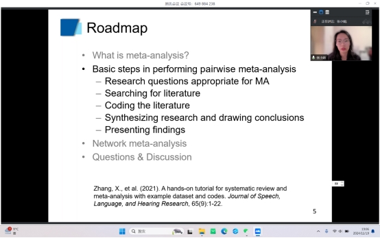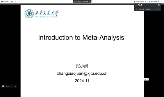 为了让学院师生了解撰写和发表应用语言学领域论文的技巧和要点,提升自身学术研究的水平和影响力,11月19日下午13:30,我院特邀西安交通大学外国语学院副教授张小娟为我院师生开展了主题为“Introduction to Meta-analysis”的专题讲座,23级、24级全体研究生参加。