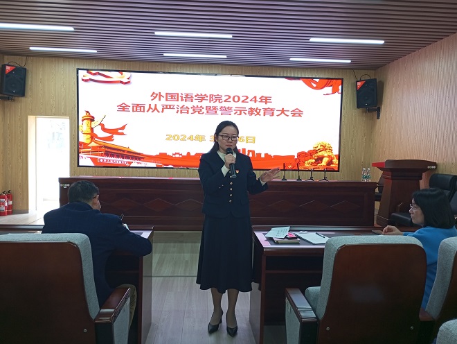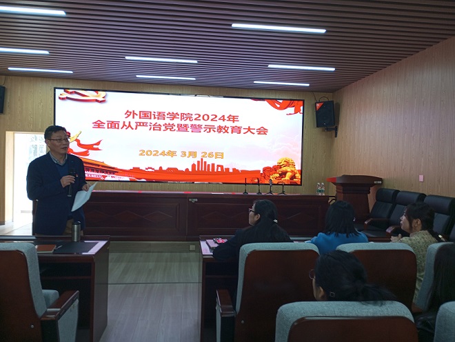 为推动全面从严治党向纵深发展,筑牢广大党员干部反腐倡廉的思想道德防线,3月26日下午,学院在金盆岭校区3号教学楼229报告厅召开2024年全面从严治党暨警示教育大会,学院党政班子成员、全体教工党员参会。会议由院长段胜峰主持。