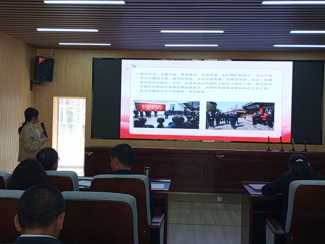 学院副院长姚尧领学习近平总书记考察湖南指示精神。她以“科技与产业”“改革与开放”“粮食与治理”“教育与人才”“文化与经济”五组关键词,介绍了3月18日至21日,习近平总书记在湖南考察学校、企业、历史文化街区与乡村的指示精神。