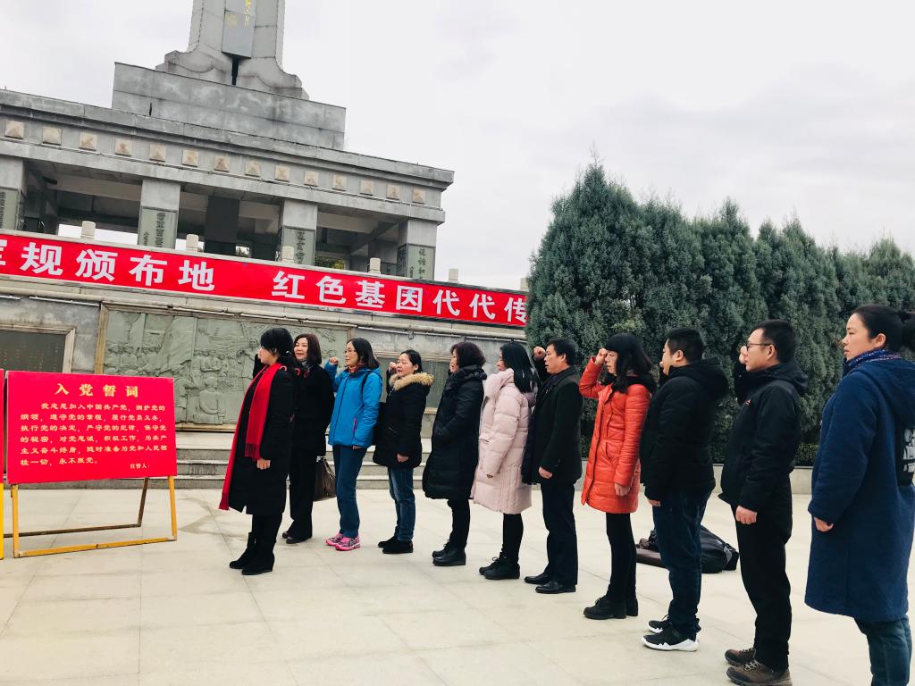 来到第一军规广场,大家仰望纪念碑,遥想当年毛泽东颁布工农革命军“三大纪律、六项注意”的宏大场景,言犹在耳,肃然起敬。在纪念碑前,面对党旗,同志们郑重地举起右手,在馆长的带领下,一字一句,庄严地重温了入党誓词。