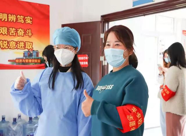4月份以来,他们全副武装,化身可爱的“大白”和“小蓝”,穿梭在学生宿舍、体育馆、电苑楼、西门传达室等地,协助医护人员开展核酸检测材料分发、健康码信息采集、检查督促师生进入校园扫场地码及测量体温等工作,努力为疫情防控工作贡献力量,用实际行动彰显兰台人的责任与担当。
