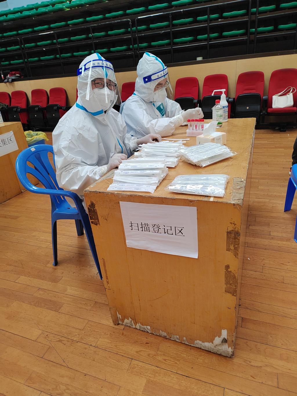 46日,刘红、何潘毅在金盆岭体育馆协助开展核酸检测工作