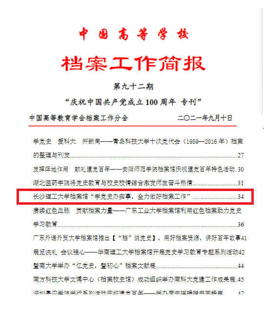《中国高等学校档案工作简报》首次报道LETOU官网档案工作信息。LETOU体育平台档案馆“学党史办实事,全力做好档案工作”入选《中国高等学校档案工作简报》第九十二期——“庆祝中国共产党成立100周年专刊”。此专刊共报道了全国25所高校的相关活动,LETOU官网是唯一入选的湖南高校。