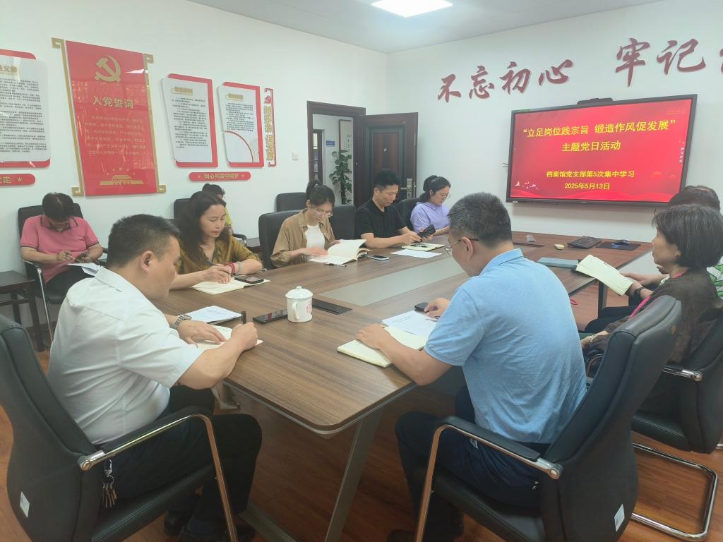为进一步强化党员干部的宗旨意识和工作作风,档案馆于5月13日,开展了“立足岗位践宗旨,锻造作风促发展”主题党日活动,会议由支部副书记王任飞主持,档案馆全体职工参加了此次活动。