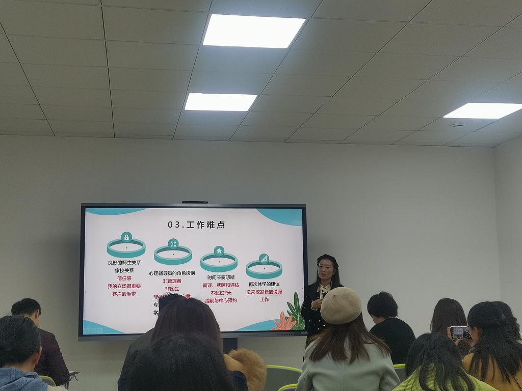 最后,龚勋对心理辅导员的工作提出了新的要求。一是找准工作定位,心理辅导员是学院心理健康教育的组织者,学生心理的辅导者,心理危机干预的主要力量,在工作中要理解、接纳学生,了解学生心理需求,严守保密原则。二是提升谈话技巧,构筑良好师生关系,全面收集重点信息。三是加强日常管理,妥善处理学生陪读、外宿、租房等现象。
