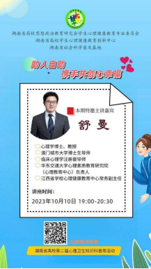 - “助人自助,携手共创心幸福”成长讲堂 -    为响应“全省师生共上一堂课”活动,要求各个学院自行组织观看舒曼教授“助人自助,携手共创心幸福”心理科普专题讲座。通过各个学院的反馈,同学们反应舒曼老师的讲座深入浅出,让同学们学会了如何在现实生活中运用和实践心理学知识。 -