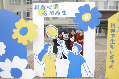 为吸引同学对精神卫生宣传周的关注,工作人员通过温暖的玩偶形象对同学们进行科普宣传,引导同学在本次活动的主题立牌前进行合影留念。