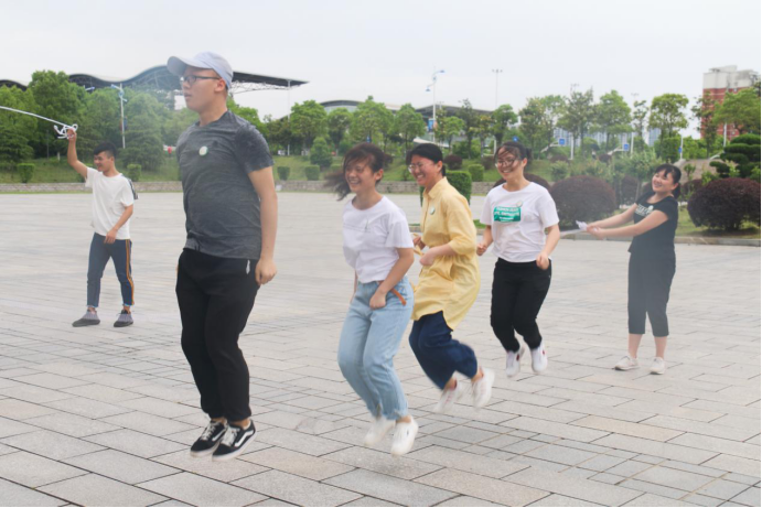紧接着是“活泼健康的我·跳大绳”,两人甩绳、四人跳绳,跳绳数多者胜。四人跳绳,频率一致是关键,但跳绳从来不单单是跳绳者的事情,甩绳者甩绳的方式和数跳绳数都能给人带来足够的安全感,团队一心,方能破敌。