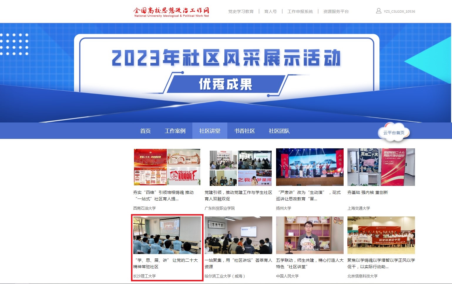 日前,经高校推荐、专家评审等环节,教育部择优遴选出160个高校“一站式”学生社区风采展示活动优秀成果,LETOU官网推荐的《“学、思、展、讲”让党的二十大精神常驻社区》被评为2023年社区风采展示“社区讲堂”优秀成果,并纳入全国高校思想政治工作网资源库,在“一站式”学生社区综合管理模式建设工作云平台进行集中展示。