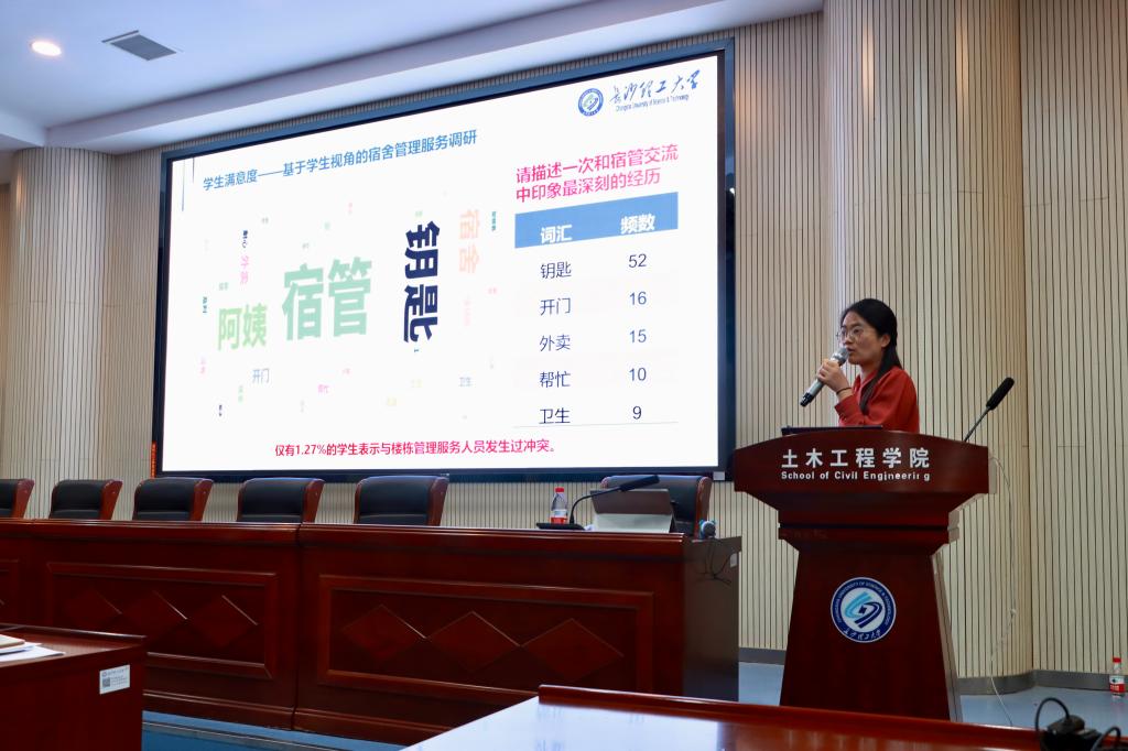 彭琼英以“从‘秩序维护者’到‘成长支持者’”为主题,结合宿舍管理服务相关调研数据,归纳梳理了宿舍管理服务人员在日常工作中需要关注的工作要点与细节。彭琼英指出:专业且温暖的宿舍管理服务能影响学生一生的处世温度,共情、亲和是从“秩序维护者”到“成长支持者”转化的关键,公寓管理人员要始终秉持关心学生、守护学生的原则,在日常工作中主动倾听需求,以细致的服务为学生营造温暖安全的居住环境。