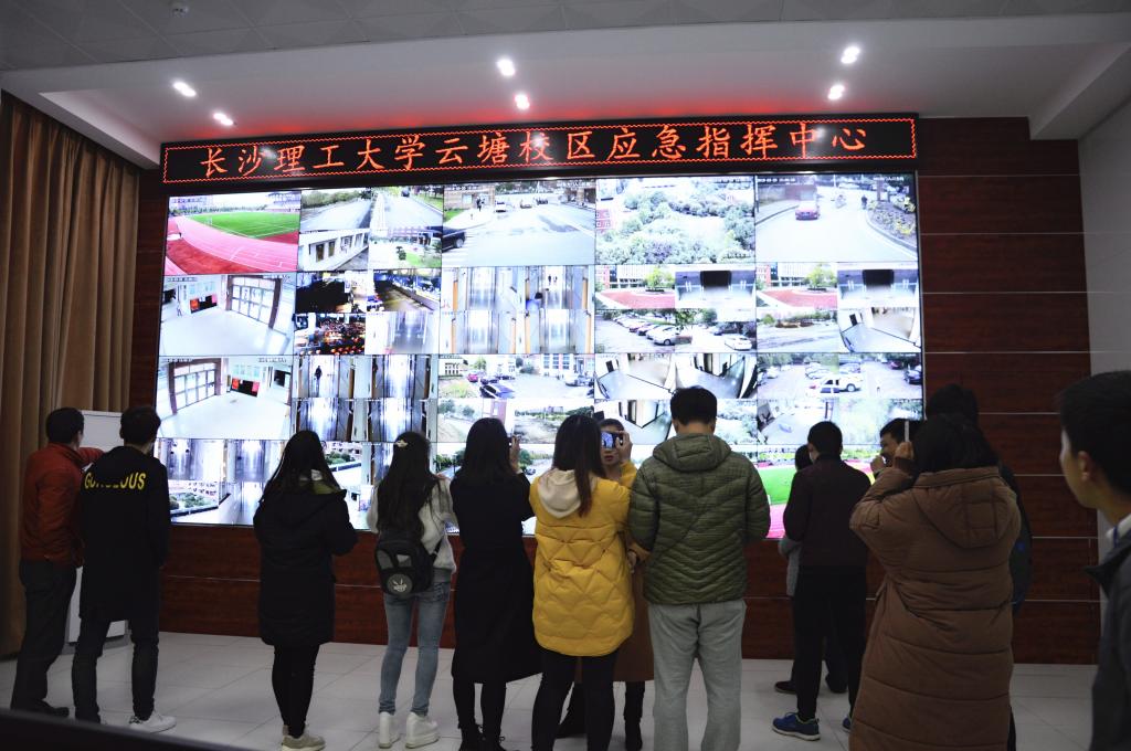 一走进指挥中心,大家都被铺满整个墙面的大屏幕吸引,大屏幕由数十块小屏幕组成,实时记录着学校各公共区域的影像。据工作人员介绍,全校有726个高清摄像头,对学校各公共区域实行了全覆盖,包括各处道路、办公楼、图书馆、医院、食堂、云霞山、梅岭以及所有学生宿舍和教学楼大厅、走廊及外围。监控视频信息自动存档,可保存60天之久。