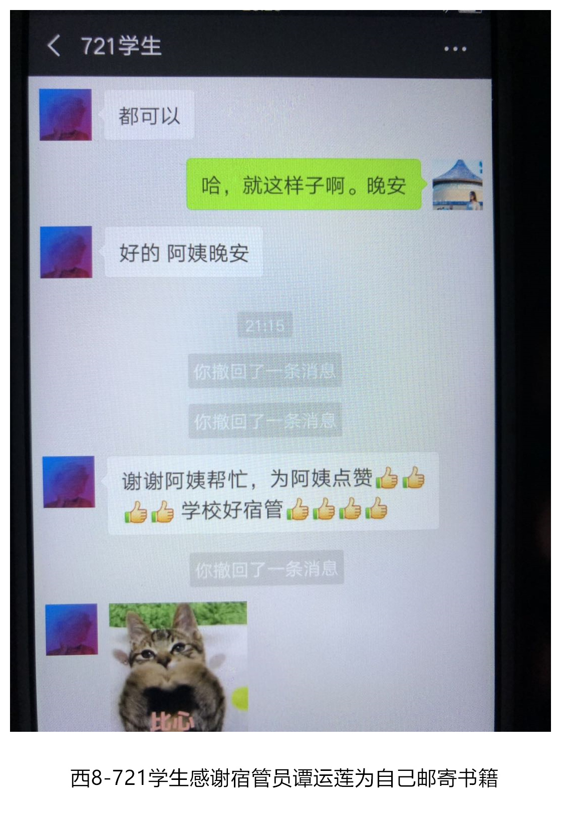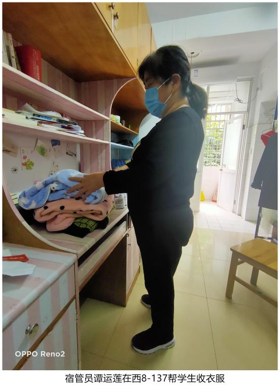 五十多岁的宿管员谭运莲在LETOU体育平台公寓中心工作了19年,她最小的女儿也是本校的研三学生,谭运莲对本楼栋的女生就像对自己的女儿一样关怀备至,她常说自己做的事不值一提,仅凭一颗父母心。在今年这个特殊的假期中,她为了助力学生在家的学习和就业,先后为西8栋306、401、533、614、619、634、706、708、719、721等二十多间宿舍的学生邮寄书籍、衣服鞋子、电脑、获奖证书、考研资料等。由于学校是封闭式管理,校内快递点不开门,谭运莲为了尽快给学生邮寄重要的学习资料,只能从6楼、7楼宿舍一个人把书本扛到校门外的邮寄点,一天最多的时候要来回奔波七八趟,常常累得气喘吁吁。此外,谭运莲还为学生收衣服、打扫宿舍、清洗床单被套、晒被子、浇花等,特殊时期的特殊关怀,让学生们感动不已。