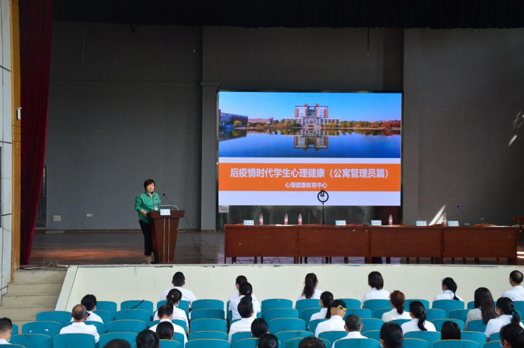 心理中心主任龚勋给大家进行了《后疫情时代学生心理健康(公寓管理员篇)》的专题培训。龚主任用鲜活的案例、生动的语言,从心理学的角度全面分析了疫情之下人的心理发展、学生复学后的心理状况、可能面临的压力和引发的问题,并一一提出了相关的处理建议。