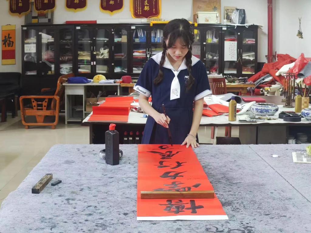 正在参加校外实训的黄美璇同学,利用晚上休息时间积极参与对联书写活动,她说:“一看到对联的内容,就感受到了学校、老师对学长学姐们的祝福与期待。在书写对联时也是满满的感动与不舍,其中的每一笔每一划也饱含了对即将离开母校的学长学姐们最诚挚的祝福,希望他们能带着这份温暖,奔赴祖国各地的工作岗位。”