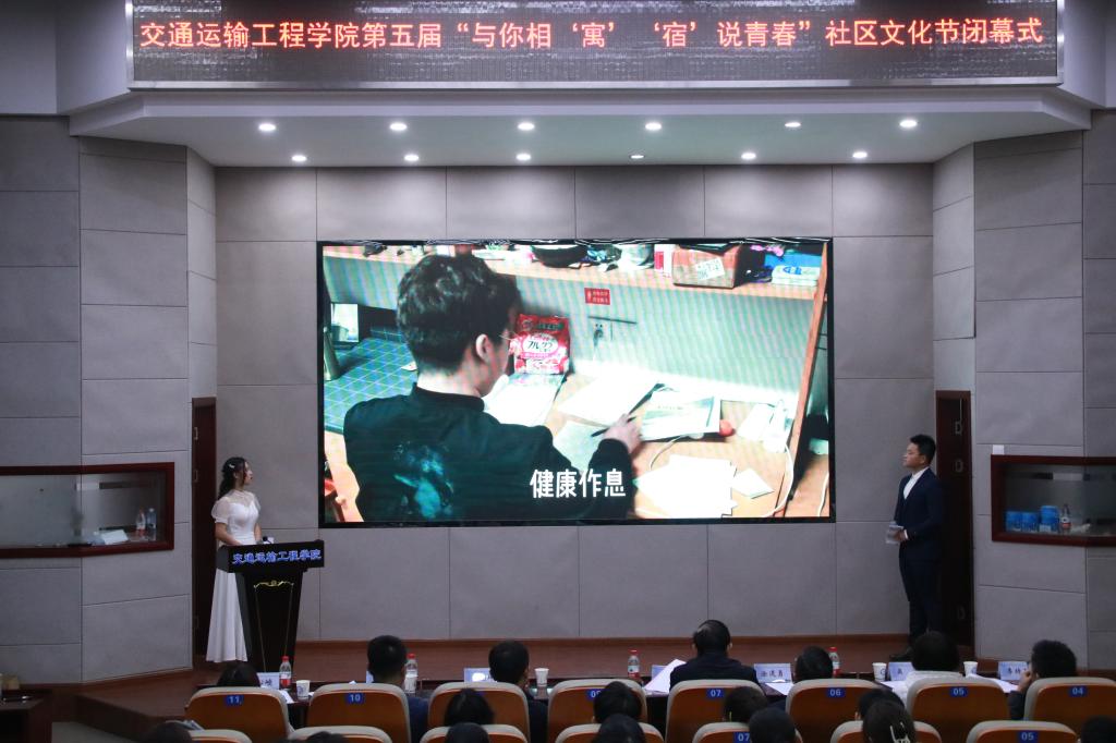一封封纸短情长的书信,一段段精心制作的视频话剧,一张张搞笑幽默的表情包......近期,交通学院的同学们在社区文化节活动中“宿”说青春,分享着宿舍生活的点点滴滴,再现一个又一个奇思妙想。为进一步推动学生社区精神文明建设,深化寝室文化生活内涵,营造健康、活泼、文明、安全、幸福的社区氛围,交通学院于12月9日晚在云塘校区工科二号楼交通科技报告厅举办第五届“与你相‘寓’ ‘宿’说青春”社区文化节闭幕式活动。校关工委常务副主任王乃厚、学工部副部长王煜坤、交通学院党委副书记涂道勇、党建特邀组织员吴滨及学工办全体辅导员出席活动,交通学院第十五届团委学生会主要成员、参赛选手、各班生活委员等近两百人参加活动。