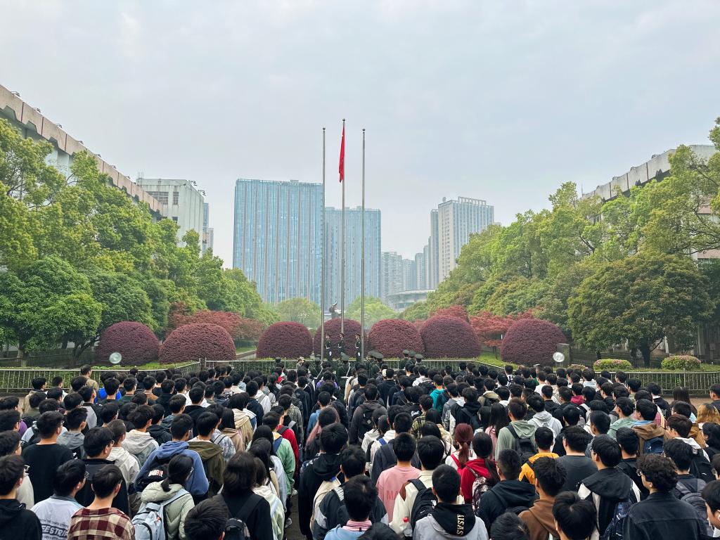 4月8日,计通学院在金盆岭校区经管办公大楼前坪举行升旗仪式。院党委副书记王觊婧、全体学工办辅导员、23级300余名同学代表参与此次升旗仪式。
