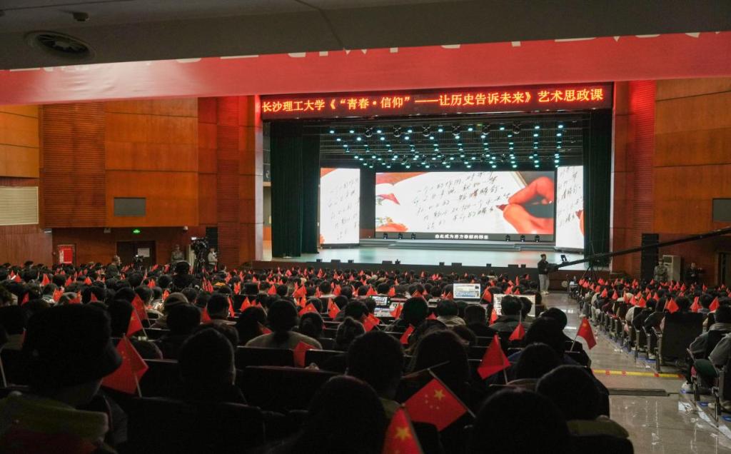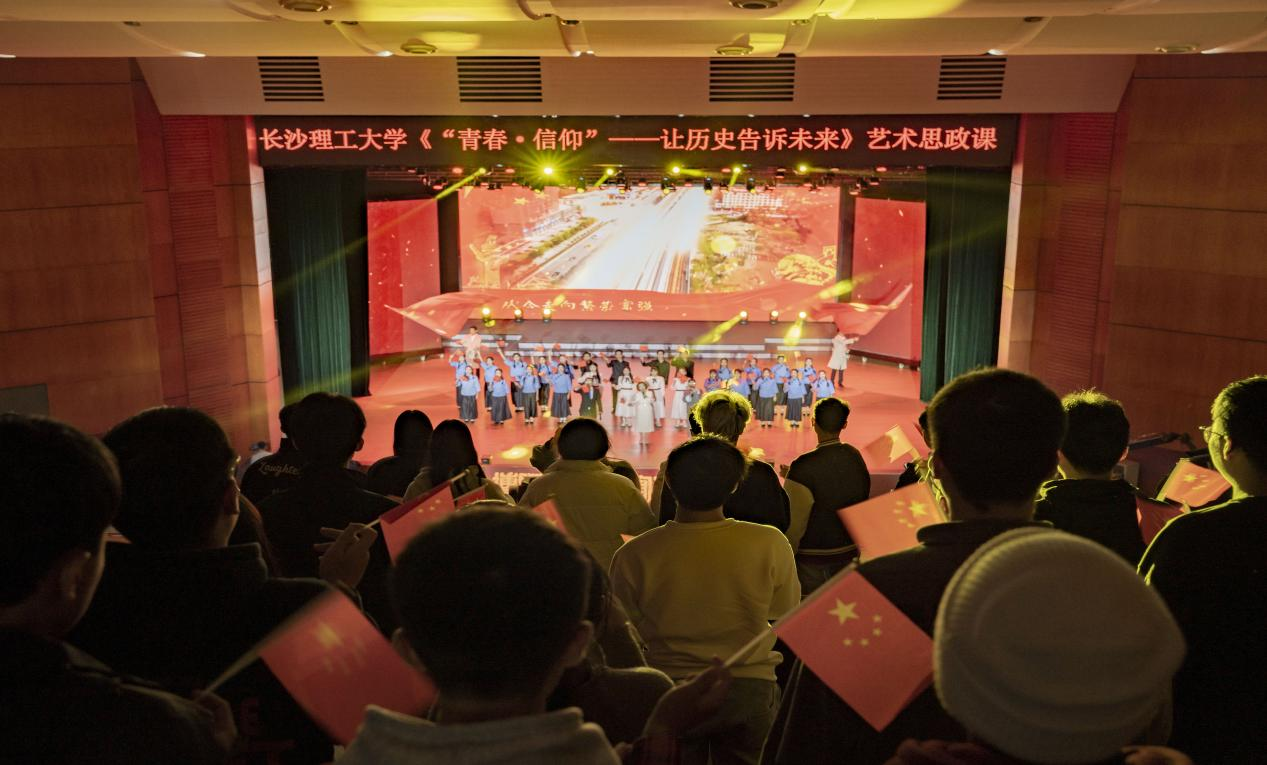 同学们专注聆听,眼神中透露出对知识的渴望与对先辈精神的敬仰。活动最后,全场学生挥舞着小国旗,齐唱《歌唱祖国》,展现了长理学子良好的精神风貌。音乐思政课让全体2024级民族学生深刻感受到了信仰的力量,也激励着各民族学生携手共进,在青春的赛道上,秉持信仰,守正拓新,砥砺前行。