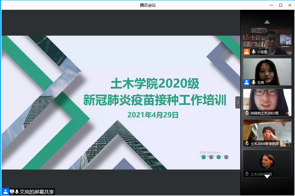 为做好在校学生新冠肺炎疫苗接种前期准备工作,确保接种工作的顺利开展,4月29日,土木工程学院召开了2020级新冠肺炎疫苗接种工作培训会,针对2020级全体新生进行了新冠肺炎疫苗接种工作培训。2020级辅导员李小军,文岚和同学们认真学习了新冠肺炎疫苗接种的相关要求和内容。