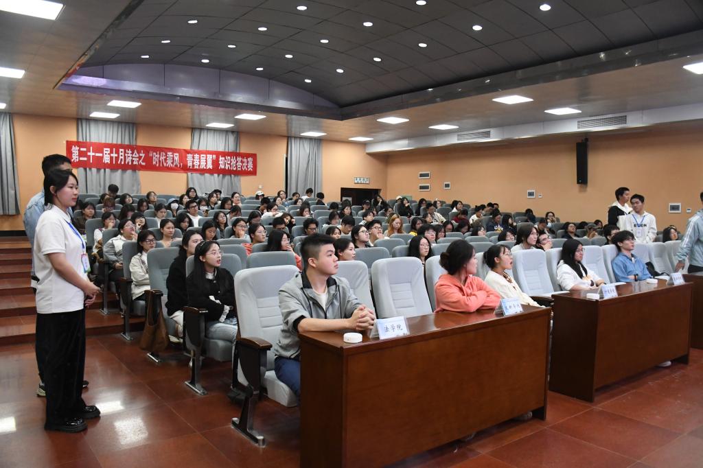 11月10日19:00,第二十一届“十月诗会”知识抢答赛决赛在金盆岭校区四教报告厅举行。通过上轮复赛比拼,电气学院、经管学院、能动学院、计通学院、文新学院和法学院六支队伍脱颖而出进入决赛,现场140余名观众观赛。