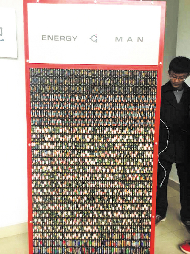 有谁见过可以为140部智能手机同时充电的超级充电器?大二女生谢妍回答道,“我们就有。”昨日,记者在LETOU体育平台云塘校区见到这个体积庞大的“大家伙”——Energy Man,和它的发明者聂翔、谢妍、汤静等人。走进工作室的时候,这群95后的大学生们还在往这个“大家伙”身上安装电池。这个巨型的电能再利用装置,长2米,宽1米,高0.2米。它上面装有300个电池格,每个电池格可以安装5节电池,所以这个“大家伙”身上一共有1500节电池,而这些电池全部都来源于生活中的废旧电池。