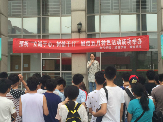 2017年5月21日,下午2:30分,筹划已久的由电气学院勤助部,经管学院资助部,数统学院勤助部共同主办的五月诚信“立诚于心,树信于行”活动在图书馆东侧广场拉开帷幕。电气学院资助老师邵巧艳亲临现场致辞。