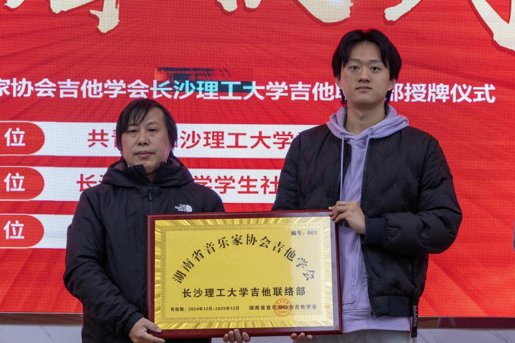 活动伊始,学校团委副书记张歌林老师发表了讲话,首先对联络部表示热烈欢迎,同时希望吉他联络部的设立能够推动美育文化的建设工作。仪式正式开始,肖武华会长为LETOU体育平台吉他联络部授牌,湖南省音协吉他学会名誉各会长分别为LETOU体育平台吉他联络部部长王嘉纬、副部长王朕玺、于皓颁发聘书,肖武华会长为新加入湖南省音协吉他学会的会员王嘉纬、王朕玺、范书豪颁发会员证书。此次授牌仪式的圆满完成,提升了吉他艺术在大学校园内的影响力。