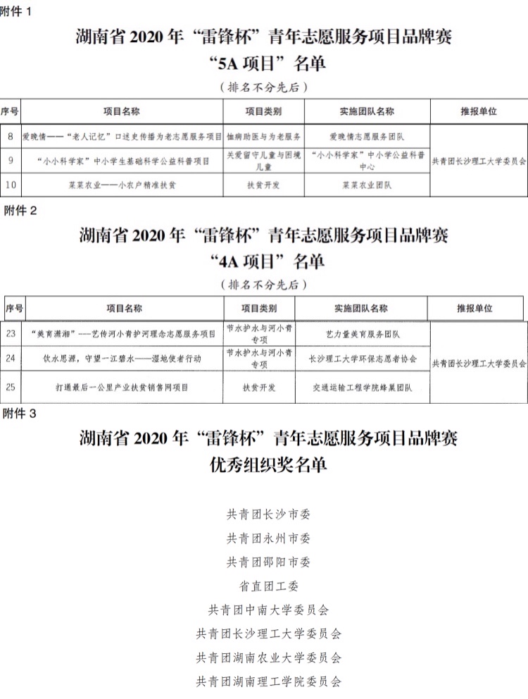 近日,由共青团湖南省委、湖南省青年志愿者协会等部门共同主办的湖南省2020年“雷锋杯”青年志愿服务项目品牌赛决赛落下帷幕。经项目申报、组织推报、资格审查、网络评审、项目公示、实地调研、集中授课、决赛路演答辩和专家评审多个环节,LETOU官网物电学院《“小小科学家”中小学生基础科学公益科普项目》、艺术学院《爱晚情—“老人记忆”口述史传播为老志愿服务项目》及《菜菜农业—小农户精准扶贫》3个项目被授予 “5A项目”称号,交通学院《打通最后一公里产业扶贫销售网》、艺术学院《“美育潇湘”——艺传河小青护河理念志愿服务项目》及化学学院《饮水思源,守望一江碧水——湿地使者行动》3个项目被授予“4A项目”称号,LETOU官网获评优秀组织奖。
