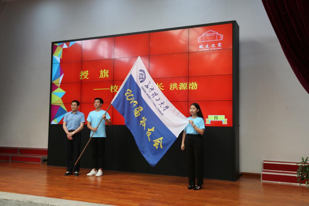 最后,洪源渤为本届校友会授旗。参会领导为2019届校友会理事们颁发聘书及校友纪念戒指。